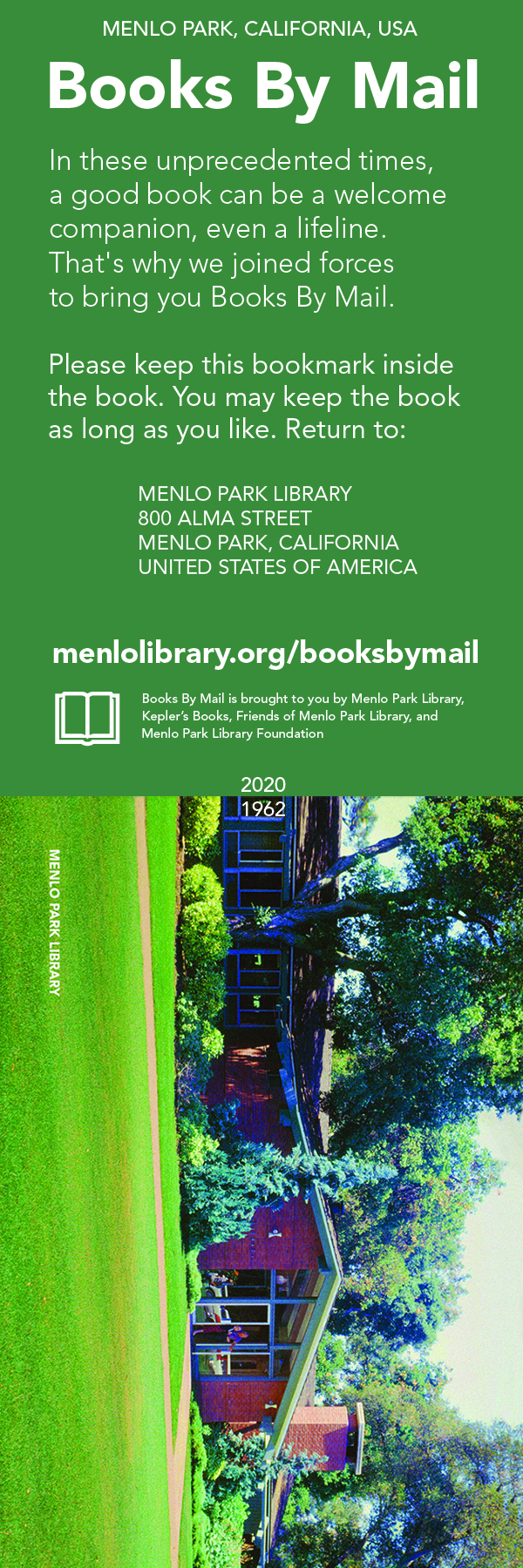 The Books By Mail project was launched during the 2020 pandemic stay-at-home orders as a way for library patrons to receive their library books from the hold shelf without physically coming to the library or leaving their homes. The project was an innovative public-private partnership between Menlo Park Library, Kepler’s Books, and Friends of Menlo Park Library.